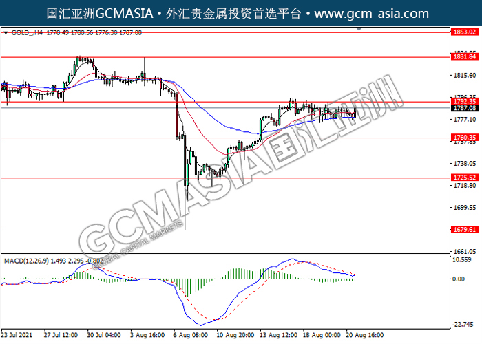 GOLD_,H4:黄金震荡盘整,目前测试靠近前期压力。然而,MACD空头动能略减,若突破可继续看多为主。上方关注1792.35压力和1831.85压力,下方关注1760.35支撑和1725.50。
