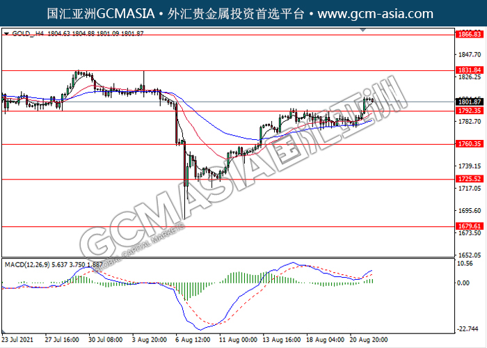 GOLD_,H4:黄金近期突破前期压力震荡上行。MACD形成金叉,动能略增,短期继续看多为主。上方关注1831.85压力和1866.85压力,下方关注1792.35支撑和1760.35支撑。