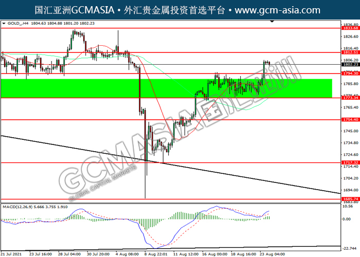 20210824 GOLD by willy | Aug 24, 2021 | 黄金 | 0 comments GOLD_,H4:黄金突破前期压力,持续上行。MACD多头动能略增,短期可关注多头为主。上方关注1812.50压力和1833.70压力,下方关注1794.30支撑和1773.35支撑。