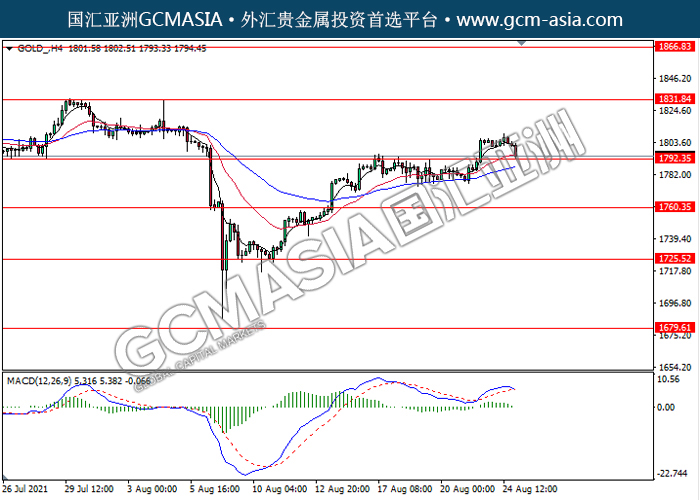 20210825 GOLD-午间 by keyk | Aug 25, 2021 | 黄金 | 0 comments GOLD_,H4:黄金近期高位承压回落,目前测试前期支撑。MACD多头动能略减,若突破关注空头为主。上方关注1831.85压力和1866.85压力,下方关注1792.35支撑和1760.35支撑。