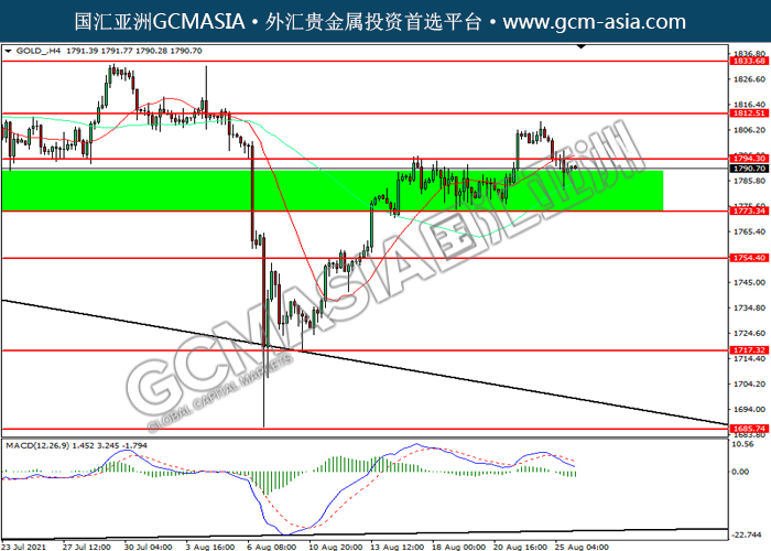 20210826 GOLD by willy | Aug 26, 2021 | 黄金 | 0 comments GOLD_,H4:黄金高位回落。MACD空头动能略增,短期可关注空头为主。上方关注1794.30压力和1812.50压力,下方关注1773.35支撑和1754.40支撑。