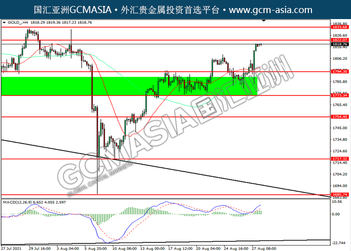 20210830 GOLD by willy | Aug 30, 2021 | 黄金 | 0 comments GOLD_,H4:黄金震荡上行,目前测试前期压力。MACD多头动能略增,若突破可关注多头为主。上方关注1822.05压力和1833.70压力,下方关注1794.30支撑和1773.35支撑。