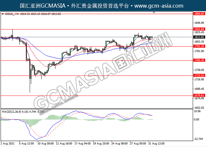 20210901 GOLD-午间 by keyk | Sep 1, 2021 | 黄金 | 0 comments GOLD_,H4:黄金近期高位回落后震荡盘整。然而,MACD显示空头信号,动能略减,短期可关注空头方向为主。上方关注1831.85压力和1866.85压力,下方关注1792.35支撑和1760.35支撑。