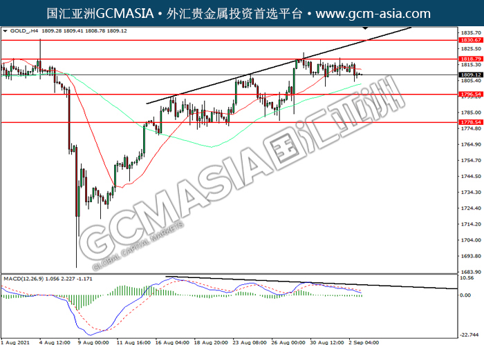 20210903 GOLD by willy | Sep 3, 2021 | 黄金 | 0 comments GOLD_,H4:黄金震荡上行,目前测试前期压力。然而,MACD空头动能略增,短期可关注技术性回调为主。上方关注1818.80压力和1830.65压力,下方关注1796.55支撑和1778.55支撑。
