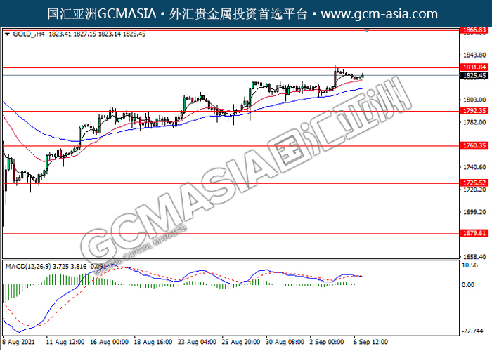GOLD_,H4:黄金震荡上行,目前测试靠近前期压力。然而,MACD形成死叉,动能略减,短期关注空头回调为主。上方关注1831.85压力和1866.85压力,下方关注1792.35支撑和1760.35支撑。