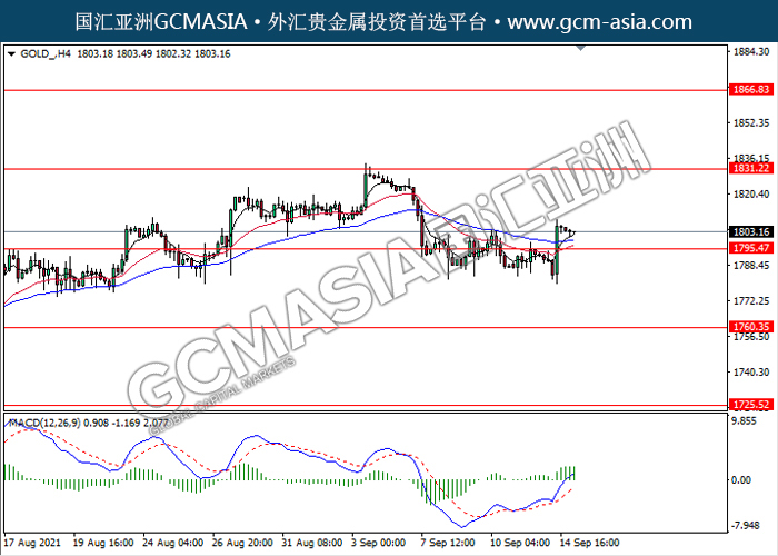 20210915 GOLD-午间 by keyk | Sep 15, 2021 | 黄金 | 0 comments GOLD_,H4:黄金突破前期压力,多头排列。MACD动能持续略增,短期继续看多为主。上方关注1831.20压力和1866.85压力,下方关注1795.45支撑和1760.35支撑。