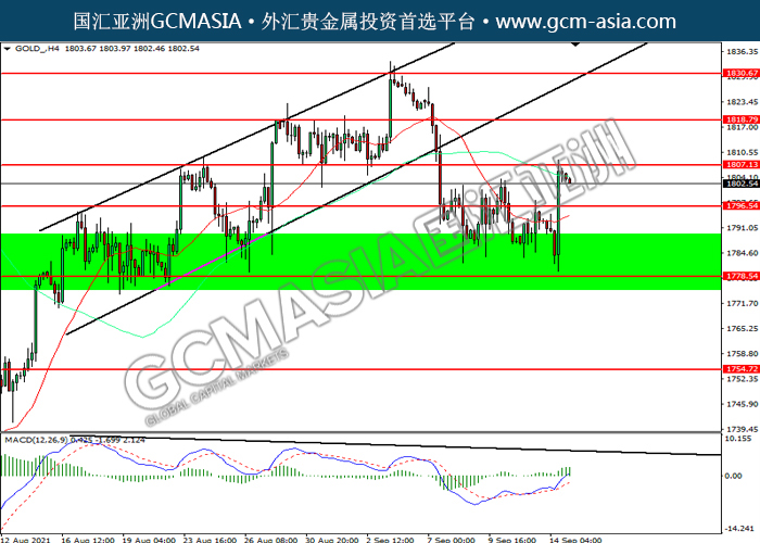 20210915 GOLD by willy | Sep 15, 2021 | 黄金 | 0 comments GOLD_,H4:黄金震荡上行,目前测试前期压力。MACD多头动能略增,若突破可关注多头为主。上方关注1807.15压力和1818.80压力,下方关注1796.55支撑和1778.55支撑。