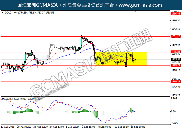 20210916 GOLD-午间 by keyk | Sep 16, 2021 | 黄金 | 0 comments GOLD_,H4:黄金仍区间交易,近期高位回落。然而,MACD多头动能略减,短期可关注空头方向为主。上方关注1806.85压力和1831.20压力,下方关注1785.80支撑和1760.35支撑。