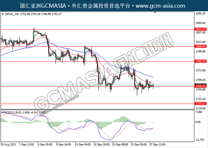 20210928 GOLD-午间 by keyk | Sep 28, 2021 | 黄金 | 0 comments GOLD_,H4:黄金震荡盘整靠近前期支撑。然而,MACD形成金叉,动能略增,短期继续看多反弹为主。上方关注1785.80压力和1806.85压力,下方关注1749.95支撑和1725.50支撑。