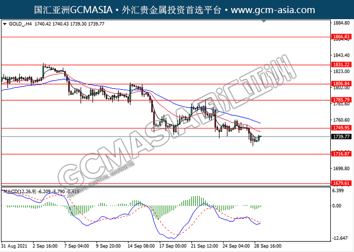 GOLD_,H4:黄金低位反弹上行。MACD空头动能略减,短期可继续看多反弹为主。上方关注1749.95压力和1785.80压力,下方关注1716.85支撑和1679.60支撑。