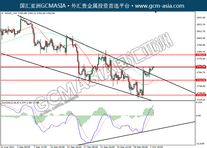 20211004 GOLD by keyk | Oct 4, 2021 | 黄金 | 0 comments GOLD_,H4:黄金震荡上行,目前测试前期压力。MACD多头动能略增,若突破可关注多头为主。上方关注1764.10压力和1780.65压力,下方关注1746.00支撑和1725.50支撑。
