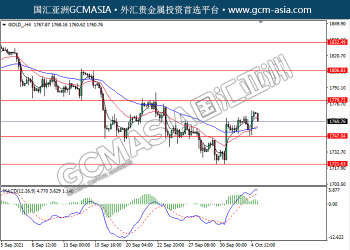 20211005 GOLD-午间 by keyk | Oct 5, 2021 | 黄金 | 0 comments GOLD_,H4:黄金高位承压回落。MACD多头动能略减,短期继续看空回调为主。上方关注1779.70压力和1806.85压力,下方关注1747.05支撑和1721.65支撑。