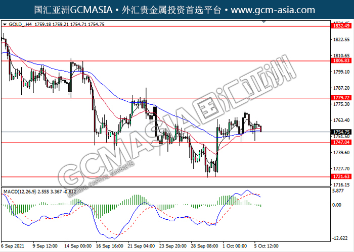 20211006 GOLD-午间 by keyk | Oct 6, 2021 | 黄金 | 0 comments GOLD_,H4:黄金高位承压回落,目前测试靠近前期支撑。MACD形成死叉,动能略减,若突破继续看空为主。上方关注1779.70压力和1806.85压力,下方关注1747.05支撑和1721.65支撑。