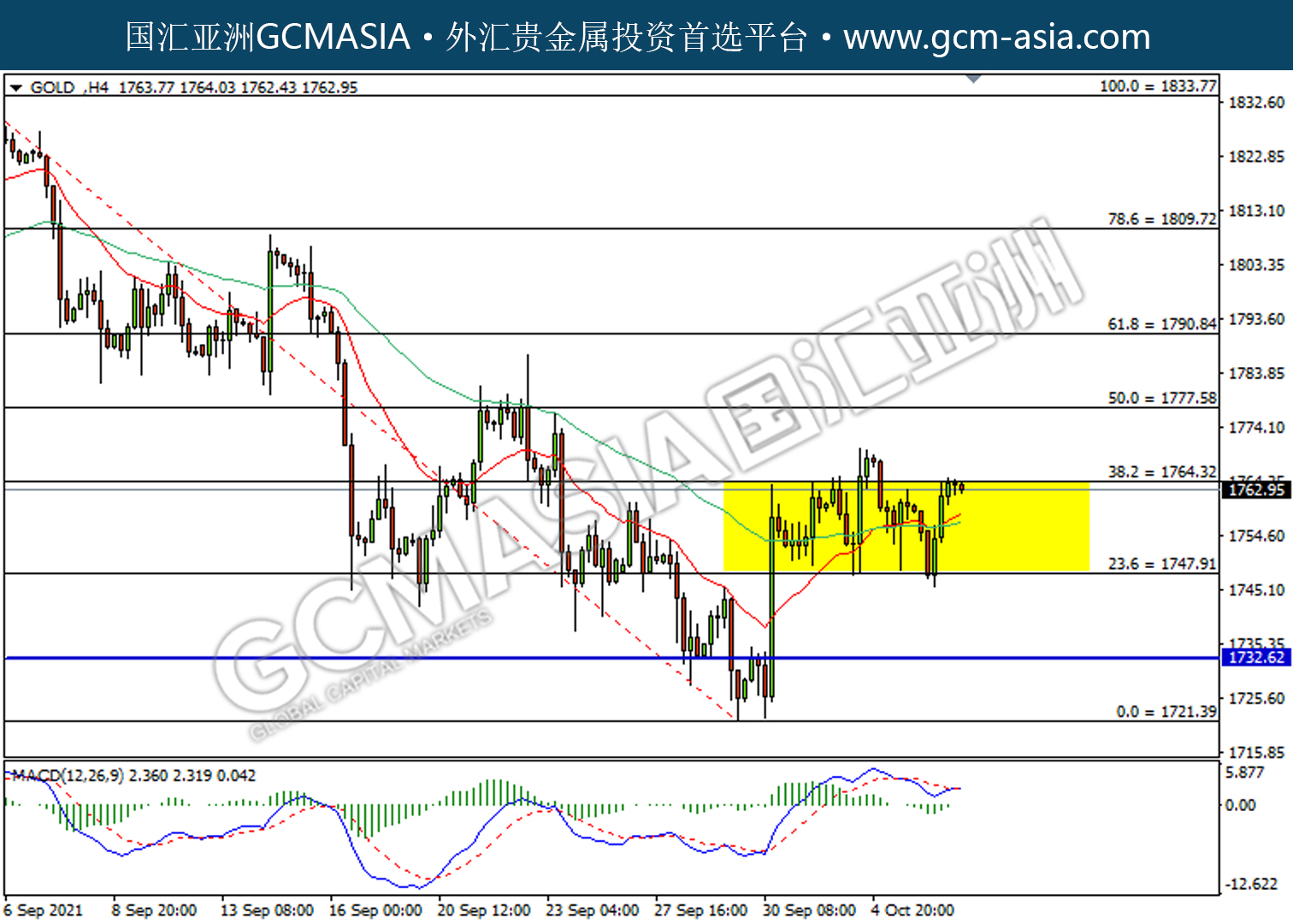 20211007 GOLD by willy | Oct 7, 2021 | 黄金 | 0 comments GOLD_,H4:黄金处于区间震荡。然而,MACD开始形成金叉,动能偏强,若上破可关注多头势力。上方关注1764.30压力和1777.60压力,下方关注1747.90支撑和1732.60支撑。