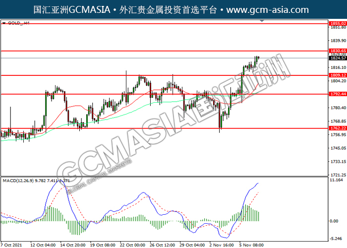2021109 GOLD by willy | Nov 9, 2021 | 黄金 | 0 comments GOLD_,H4:黄金震荡上行,目前测试前期压力。然而,MACD多头动能略减,短期可关注技术性回调为主。上方关注1830.65压力和1855.00压力,下方关注1809.10支撑和1792.45支撑