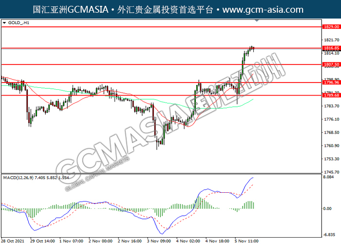 20211108 GOLD by willy | Nov 7, 2021 | 黄金 | 0 comments GOLD_,H1:黄金震荡上行,目前测试前期压力。然而,MACD空头动能略减,短期可关注技术性回调为主。上方关注1816.85压力和1829.00压力,下方关注1807.50支撑和1796.95支撑