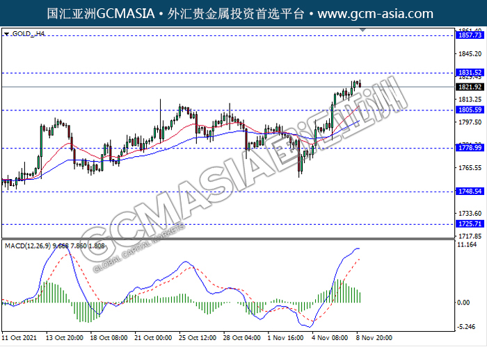 20211109 GOLD-午间 by willy | Nov 9, 2021 | 黄金 | 0 comments GOLD_,H4:黄金多头排列,目前测试靠近前期压力。然而,MACD多头动能略减,短期关注技术性空头回调为主。上方关注1831.50压力和1857.75压力,下方关注1805.60支撑和1779.00支撑