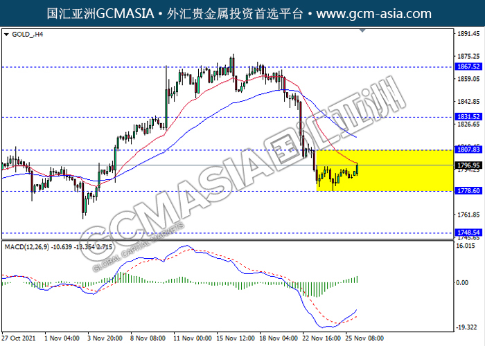 20211126 GOLD-午间 by willy | Nov 26, 2021 | 黄金 | 0 comments GOLD_,H4:黄金区间震荡盘整。然而,MACD显示多头信号,动能略增,短期可关注多头方向为主。上方关注1807.85压力和1831.50压力,下方关注1778.60支撑和1748.55支撑