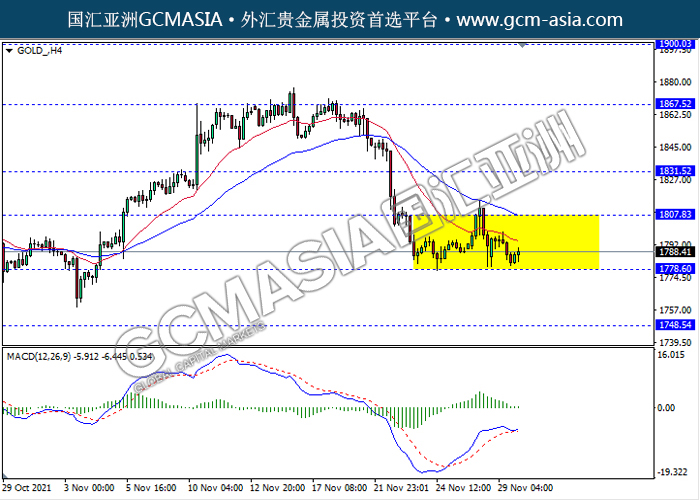 20211130 GOLD-午间 by willy | Nov 30, 2021 | 黄金 | 0 comments GOLD_,H4:黄金仍区间震荡交易,目前测试靠近前期支撑。然而,MACD显示空头信号,多头动能略减,若突破可继续看空为主。上方关注1807.80压力和1831.50压力,下方关注1778.60支撑和1748.55支撑