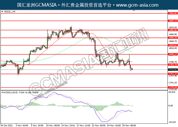 GOLD_,H4:黄金震荡下行。MACD空头动能略增,短期可关注技空头为主。上方关注1783.80压力和1809.10压力,下方关注1762.20支撑和1729.60支撑。