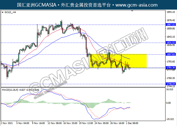 GOLD_,H4:黄金仍区间震荡交易,目前测试前期支撑。然而,MACD显示空头信号,多头动能略减,若突破可关注空头方向为主。上方关注1807.35压力和1831.50压力,下方关注1748.55支撑和1748.55支撑