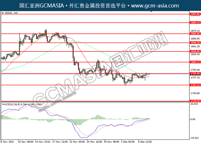 20211208 GOLD by willy | Dec 8, 2021 | 黄金 | 0 comments GOLD_,H4:黄金震荡上行,目前测试前期压力。然而,MACD多头动能略减,短期可关注技术性回调为主。上方关注1785.90压力和1809.10压力,下方关注1762.20支撑和1729.60支撑。