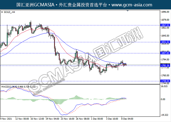 20211209 GOLD-午间 by keyk | Dec 9, 2021 | 黄金 | 0 comments GOLD_,H4:黄金震荡盘整,目前测试前期支撑。MACD多头动能略减,若突破可继续看空为主。上方关注1807.85压力和1831.50压力,下方关注1781.35支撑和1748.55支撑