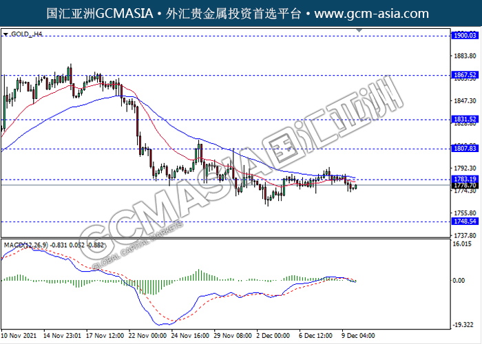 20211210 GOLD-午间 by keyk | Dec 10, 2021 | 黄金 | 0 comments GOLD_,H4:黄金突破前期支撑,震荡下行。MACD形成死叉,动能略减,短期可继续看空方向为主。上方关注1783.20压力和1807.85压力,下方关注1748.55支撑和1725.70支撑