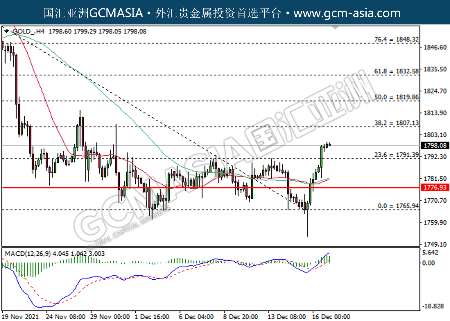 20211217 GOLD by willy | Dec 17, 2021 | 黄金 | 0 comments GOLD_,H4:黄金震荡上行。MACD已形成金叉,动能偏强,短期关注多头势力为主。上方关注1807.15压力和1819.85压力,下方关注1791.40支撑和1776.95支撑。