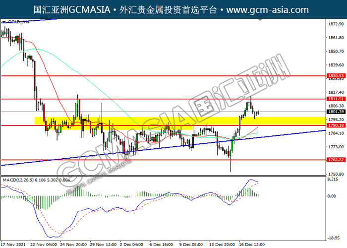 20211220 GOLD-午间 by willy | Dec 20, 2021 | 黄金 | 0 comments GOLD_,H4:黄金震荡下行。MACD多头动能略减,短期可关注空头为主。上方关注1811.50压力和1830.55压力,下方关注1790.20支撑和1762.20支撑。