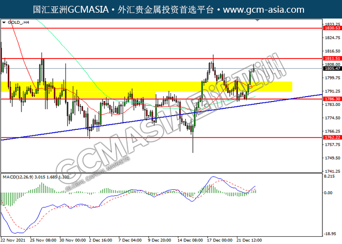20211223 GOLD-午间 by willy | Dec 23, 2021 | 黄金 | 0 comments GOLD_,H4:黄金震荡上行。MACD多头动能略增,短期可关注多头为主。上方关注1811.50压力和1830.55压力,下方关注1786.30支撑和1762.20支撑。