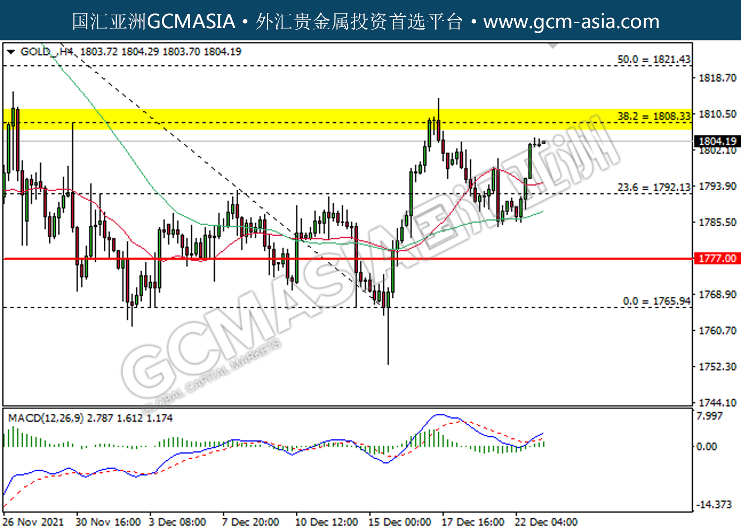 GOLD_,H4:黄金受承压回落。MACD多头动能有所略减,短期关注空头势力为主。上方关注1808.35压力和1821.45压力,下方关注1792.15支撑和1777.00支撑。