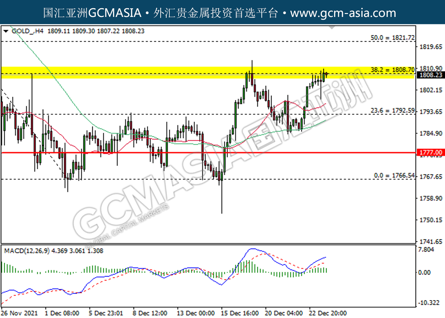 20211224 GOLD by willy | Dec 24, 2021 | 黄金 | 0 comments GOLD_,H4:黄金震荡上行。然而,MACD多头动能有所略减,短期关注空头势力为主。上方关注1808.70压力和1821.70压力,下方关注1792.60支撑和1777.00支撑。