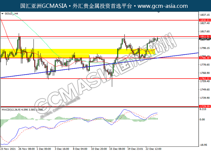 20211227 GOLD-午间 by willy | Dec 27, 2021 | 黄金 | 0 comments GOLD_,H4:黄金震荡上行,目前测试前期压力。然而,MACD多头动能略减,短期可关注技术性回调为主。上方关注1811.50压力和1830.55压力,下方关注1786.30支撑和1762.20支撑。