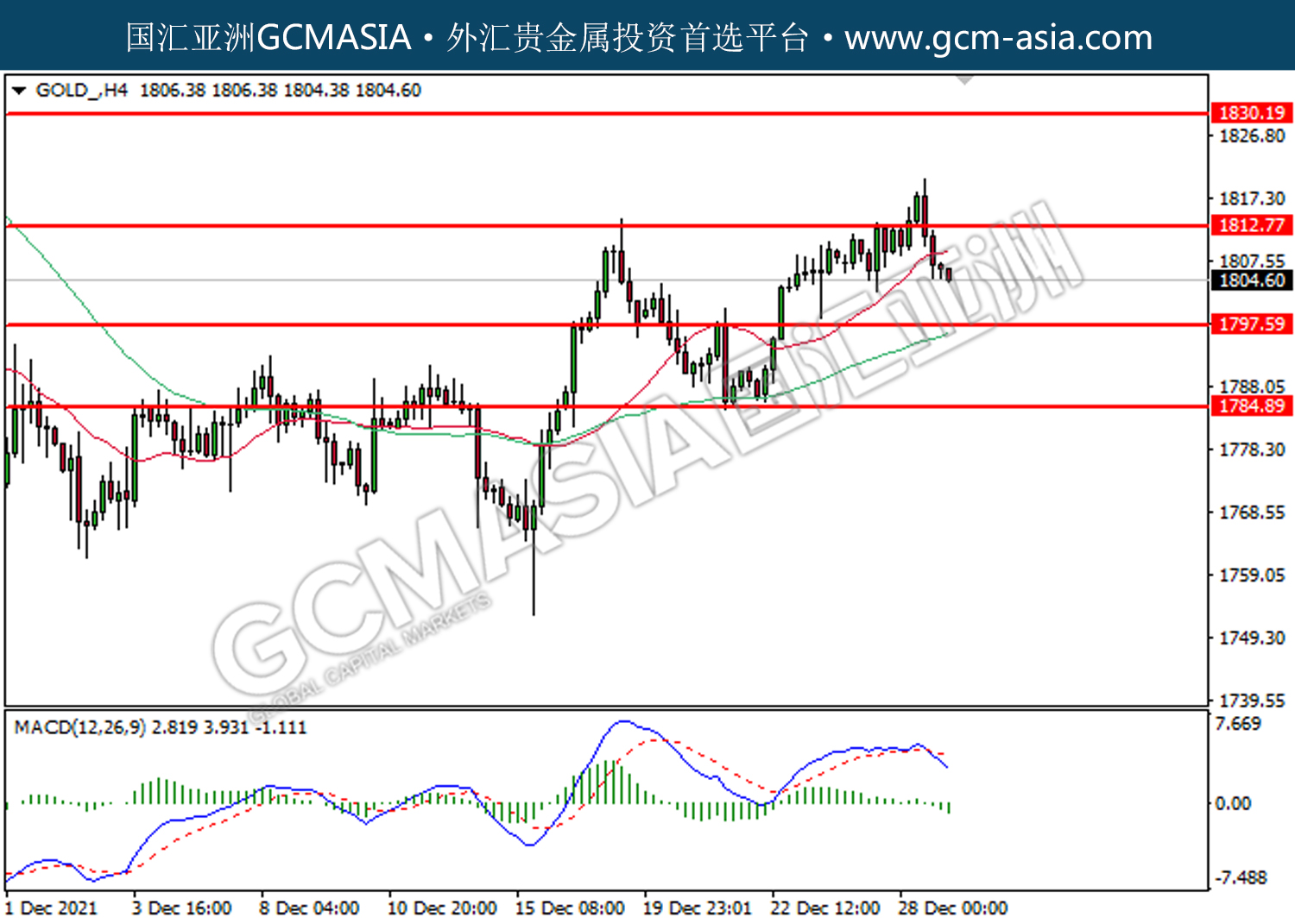 20211229 GOLD by willy | Dec 29, 2021 | 黄金 | 0 comments GOLD_,H4:黄金高位承压回落。MACD已形成熊背离信号,短期关注空头势力为主。上方关注1812.80压力和1830.20压力,下方关注1797.60支撑和1784.90支撑。