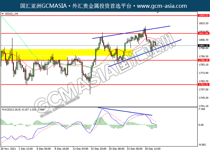 20211230 GOLD-午间 by willy | Dec 30, 2021 | 黄金 | 0 comments GOLD_,H4:黄金高位回落。MACD空头动能略增,短期可关注空头为主。上方关注1812.85压力和1830.55压力,下方关注1786.30支撑和1762.20支撑。