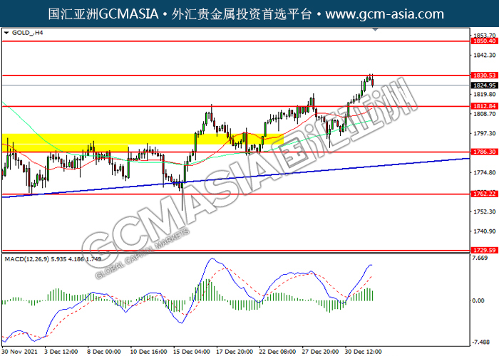 GOLD_,H4:黄金震荡上行,目前测试前期压力。然而,MACD多头动能略减,短期可关注技术性回调为主。上方关注1830.55压力和1850.40压力,下方关注1812.85支撑和1786.30支撑。