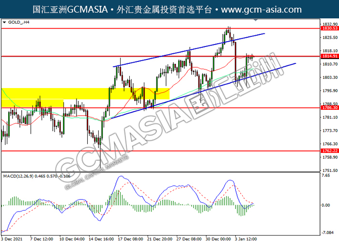 20220105 GOLD-午间 by willy | Jan 5, 2022 | 黄金 | 0 comments GOLD_,H4:黄金低位反弹,目前测试前期压力。MACD空头动能略减,若突破可关注多头为主。上方关注1814.90压力和1830.55压力,下方关注1786.30支撑和1762.20支撑。