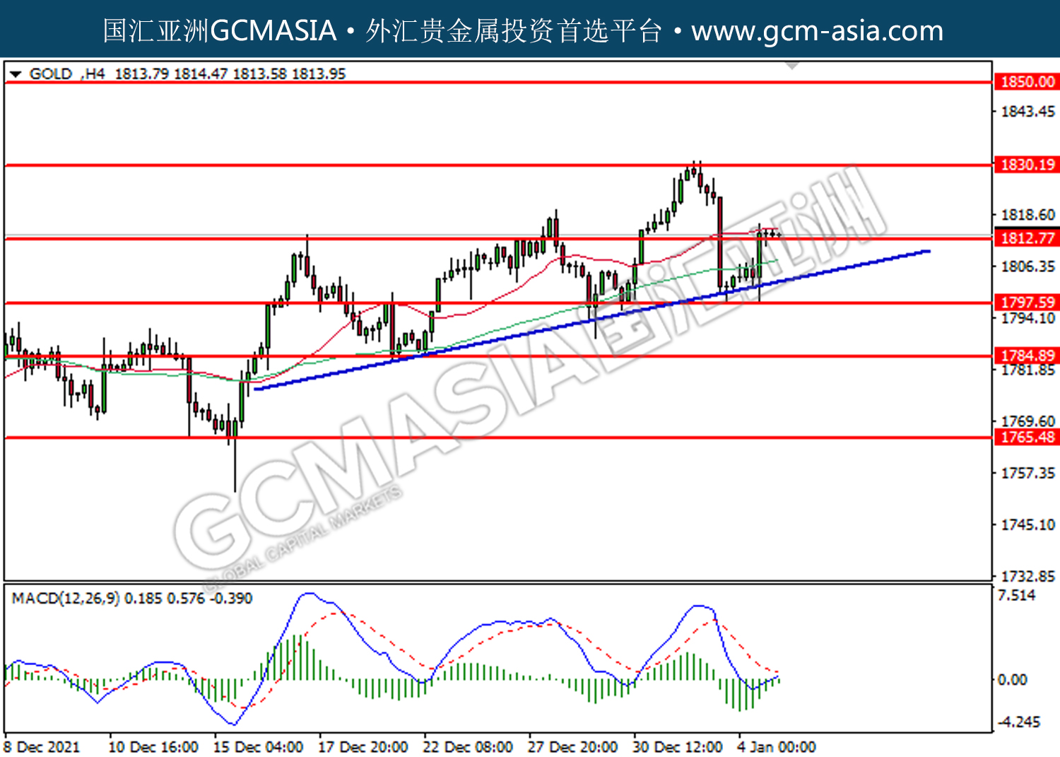 20220105 GOLD by willy | Jan 5, 2022 | 黄金 | 0 comments GOLD_,H4:黄金低位反弹。MACD空头动能有所略减,短期关注多头势力为主。上方关注1830.20压力和1850.00压力,下方关注1812.80支撑和1797.60支撑。