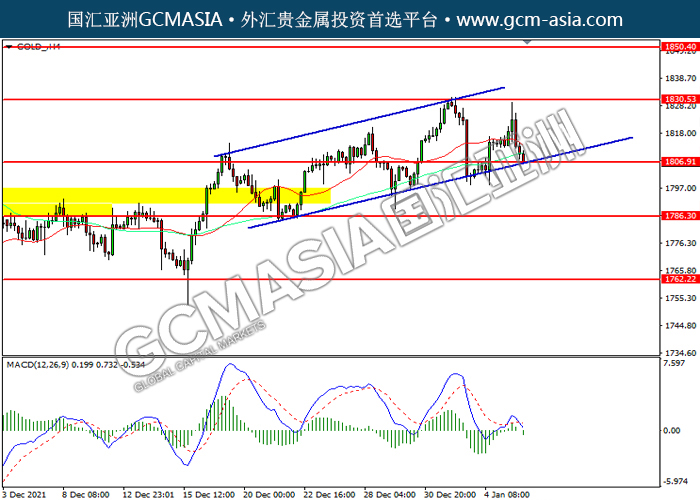 GOLD_,H4:黄金震荡下行,目前测试前期支撑。MACD空头动能略增,若突破可关注空头为主。上方关注1830.55压力和1850.40压力,下方关注1806.90支撑和1786.30支撑。