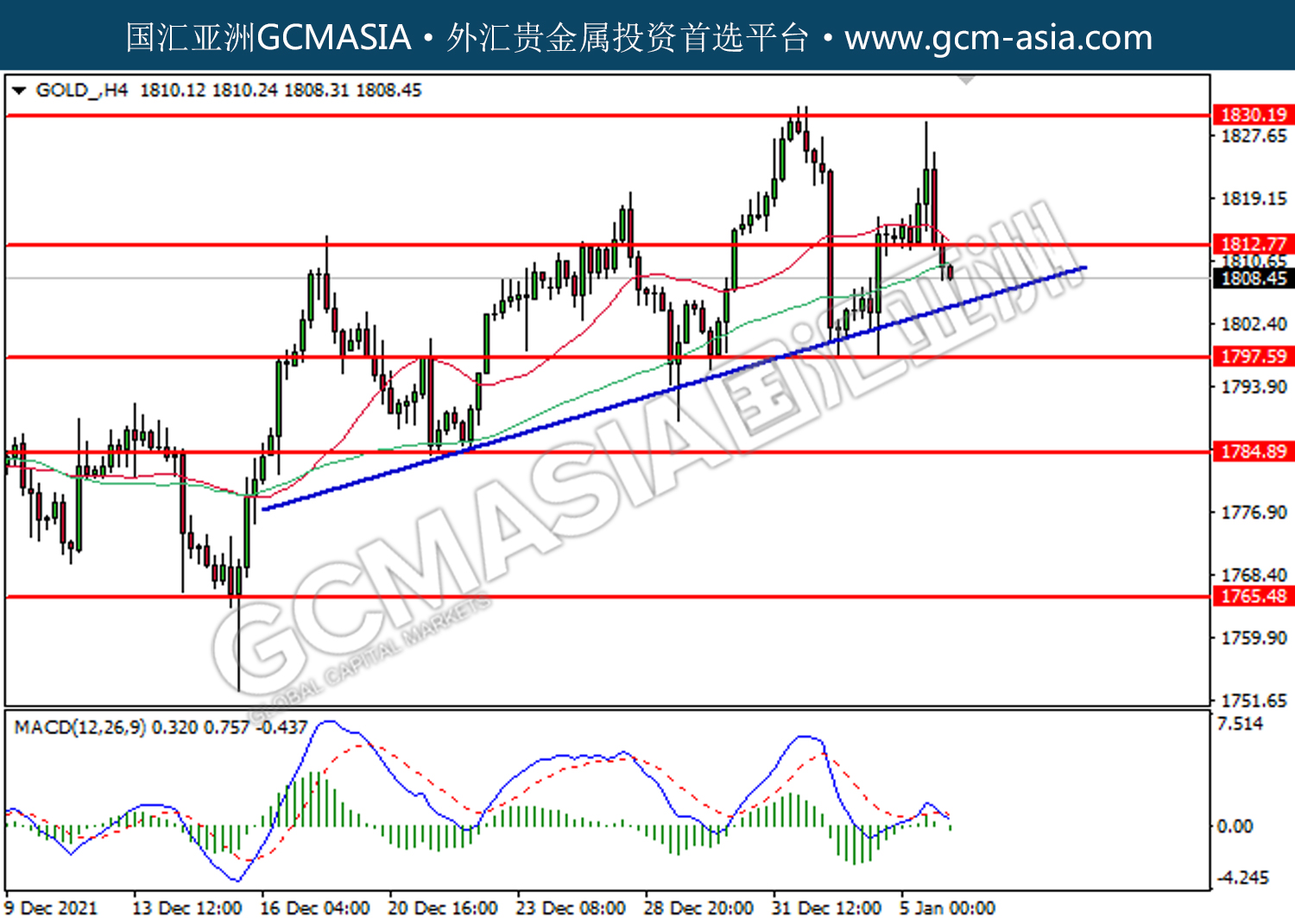 20220106 GOLD by willy | Jan 6, 2022 | 黄金 | 0 comments GOLD_,H4:黄金受承压回落。MACD已形成死叉,动能转弱,短期关注空头势力为主。上方关注1812.80压力和1830.20压力,下方关注1797.60支撑和1784.90支撑。