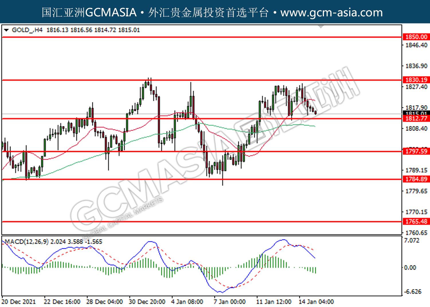 20220117 GOLD by willy | Jan 17, 2022 | 黄金 | 0 comments GOLD_,H4:黄金受承压回落。MACD已形成死叉,动能转弱,若下破可继续看空。上方关注1830.20压力和1850.00压力,下方关注1812.80支撑和1797.60支撑。
