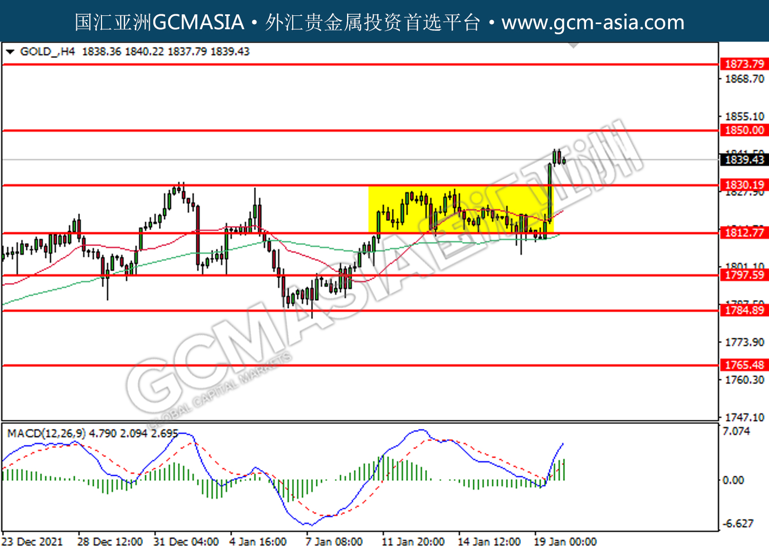 GOLD_,H4:黄金低位反弹。MACD已形成金叉,动能转强,短期关注多头势力为主。上方关注1850.00压力和1873.80压力,下方关注1830.20支撑和1812.80支撑。
