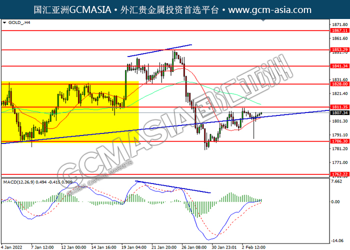 20220204 GOLD-午间 by willy | Feb 4, 2022 | 黄金 | 0 comments GOLD_,H4:黄金震荡上行,目前测试前期压力。然而,MACD多头动能略减,短期可关注技术性回调为主。上方关注1811.35压力和1828.00压力,下方关注1786.30支撑和1762.20支撑。