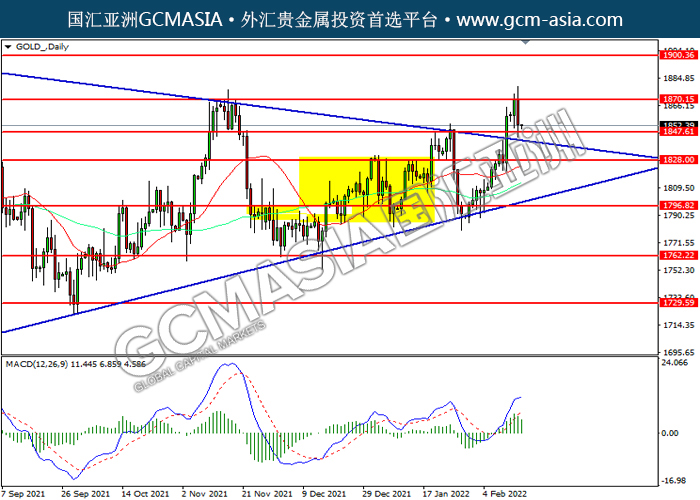 GOLD_,Daily:黄金高位回落。MACD多头动能略减,短期可关注空头为主。上方关注1870.15压力和1900.35压力,下方关注1847.60支撑和1828.00支撑。