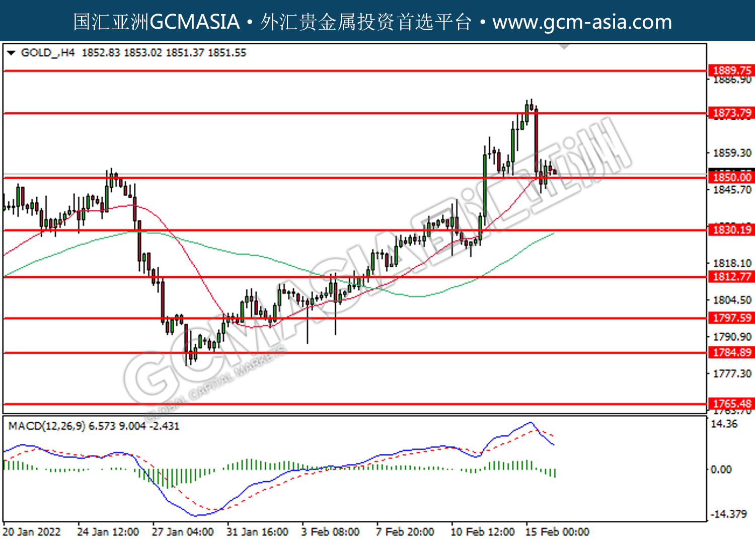 20220216 GOLD by willy | Feb 16, 2022 | 黄金 | 0 comments GOLD_,H4:黄金震荡下行。MACD已形成死叉,动能转弱,短期关注空头为主。上方关注1873.80压力和1889.75压力,下方关注1850.00支撑和1830.20支撑。