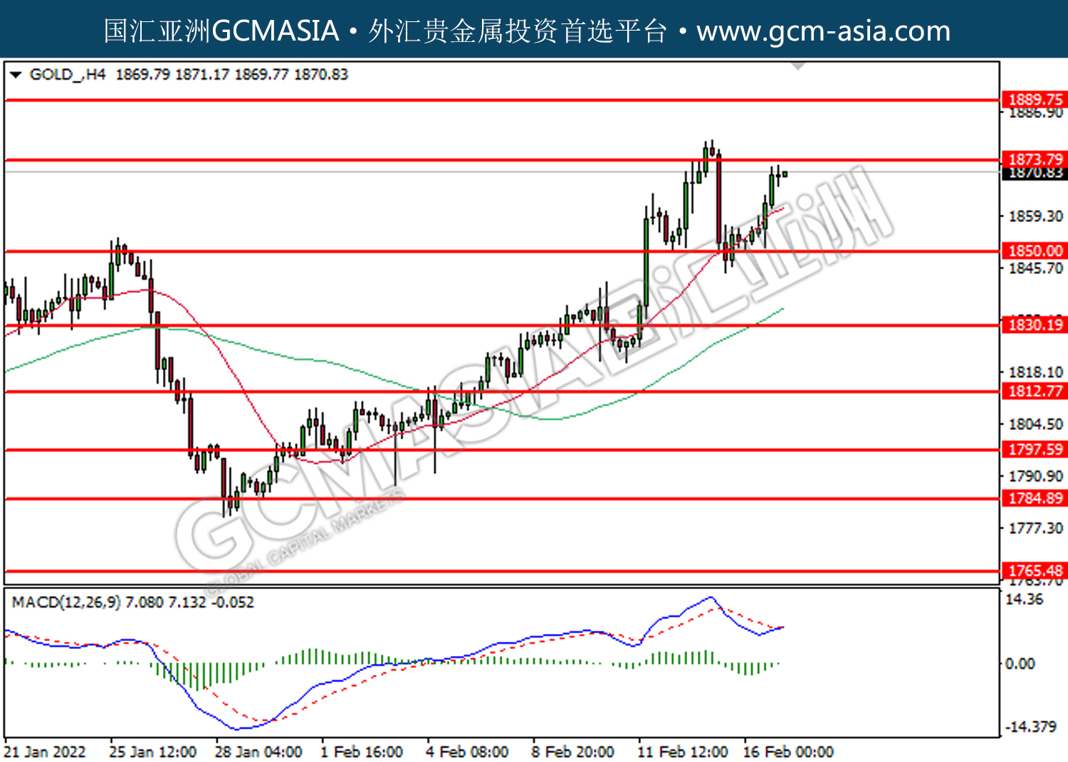 20220217 GOLD by willy | Feb 17, 2022 | 黄金 | 0 comments GOLD_,H4:黄金低位反弹。MACD已形成金叉,动能转强,短期关注多头为主。上方关注1873.80压力和1889.75压力,下方关注1850.00支撑和1830.20支撑。