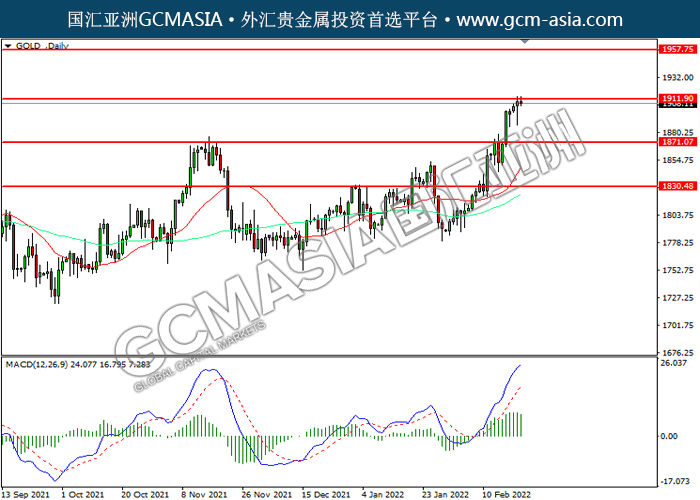 20220222 GOLD-午间 by willy | Feb 22, 2022 | 黄金 | 0 comments GOLD_,Daily:黄金价格震荡上行,目前测试前期压力。然而,MACD多头动能略减,短期可关注技术性回调为主。上方关注1911.90压力和1957.75压力,下方关注1871.05支撑和1830.50支撑。