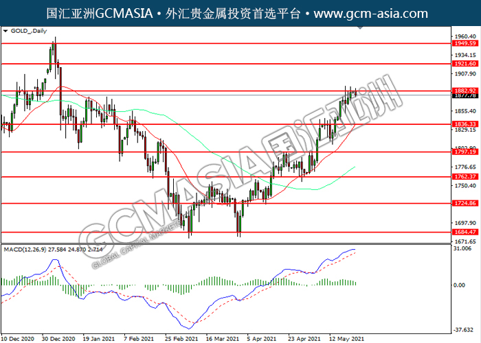 GOLD_,Daily:黄金震荡上行,目前测试前期压力。然而,MACD多头动能略减,短期可关注技术性回调为主。上方关注1882.90压力和1921.60压力,下方关注1836.35支撑和1797.20支撑。