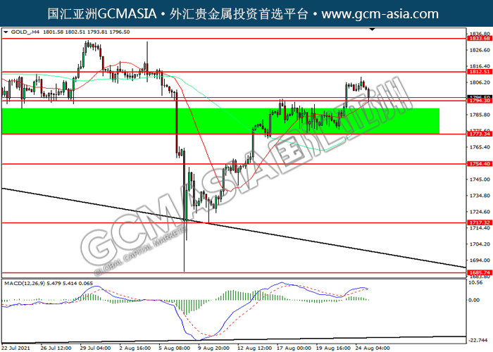 20210825 GOLD by willy | Aug 25, 2021 | 黄金 | 0 comments GOLD_,H4:黄金高位回落。MACD多头动能略减,若下破可关注空头为主。上方关注1812.50压力和1833.70压力,下方关注1794.30支撑和1773.35支撑。
